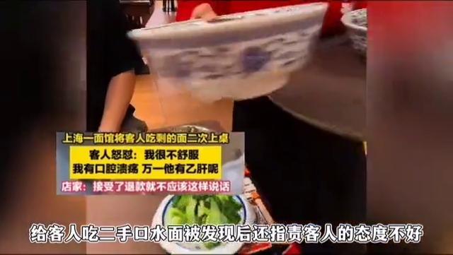 上海一家餐馆第二次向顾客提供剩下的面条。店主说:你收到退款后不应该说这种话。在被抓到向顾客提供二手面条后,他还指责顾客没有礼貌。在上海第九医院附近点过这些重庆小面的人都受到了伤害。事件起因是一名女孩到这家餐厅吃面。女孩点了一份豌豆面,但吃了两口后,不仅发现味道不对,还发现豌豆面里有西红柿。想起一位顾客刚刚退回一碗番茄鸡蛋面,小姐姐立即意识到,老板把别人退回的二手面退回来,换了配料,给她当了豌豆面。找到老板争辩后,对方立即良心退回了钱。在战斗中,女人变得凌乱因为他们不知道如何战斗。面馆显然做错了。他不仅批评女孩态度不好,还说卖别人剩下的面条是小事。这句话一出,住在附近的上海网友全都惊呆了,因为老板的语气显然不是第一次这么做了。看了这家店的评论后确认,这家店已经不是第一次回收面条卖给下一位顾客了。曾经有人在肥肠面里吃泡菜,有顾客在他们店里吃了蟑螂。顾客想投诉,但老板不同意,他说所有餐饮公司都会有这种情况,所以顾客一定要理解他。这家店位于医院旁边,目前还在营业。不关闭是不合理的。
